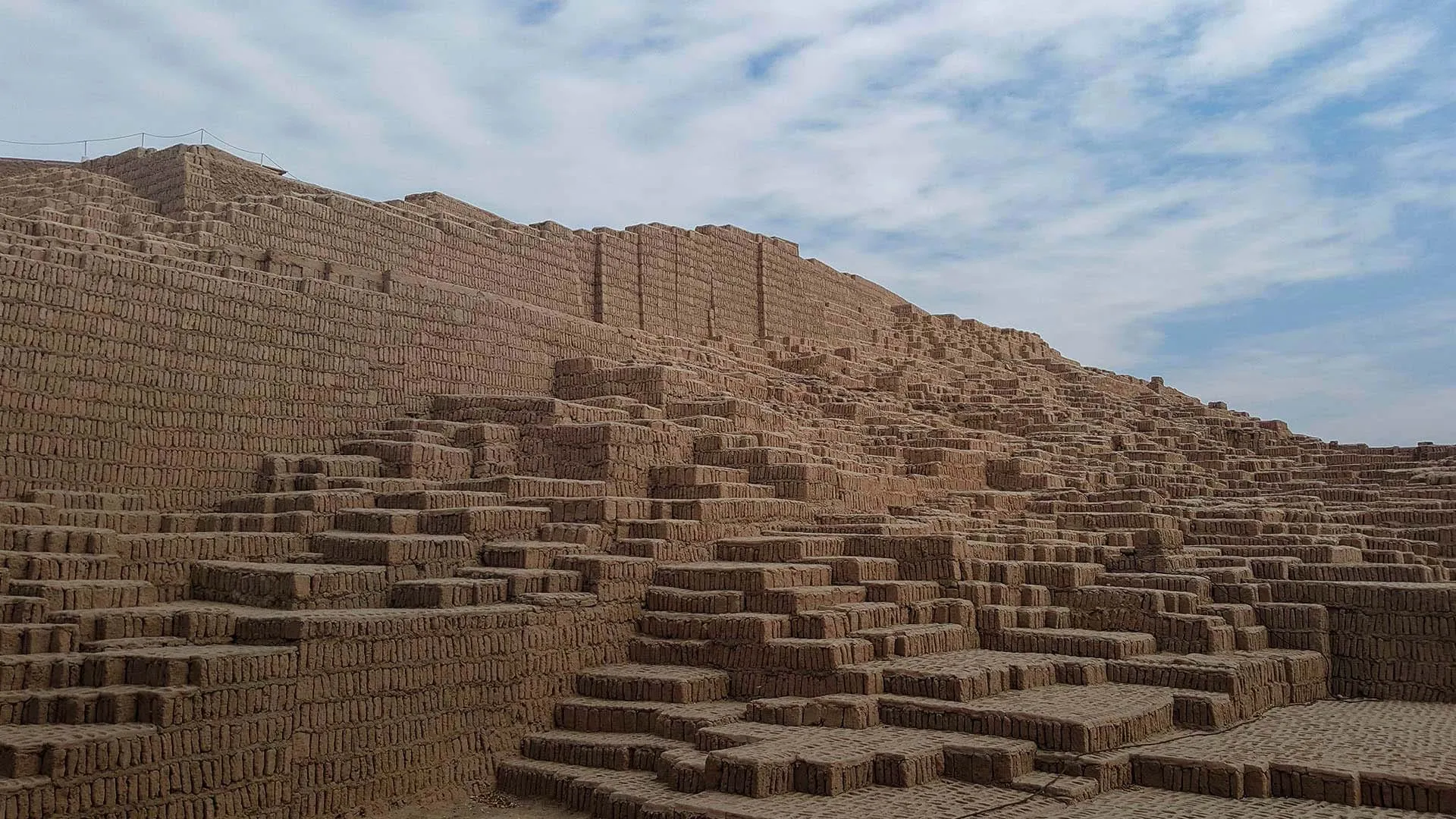 Panoramic view of a massive 2,000-year-old pre-Inca pyramid nestled in the modern city.